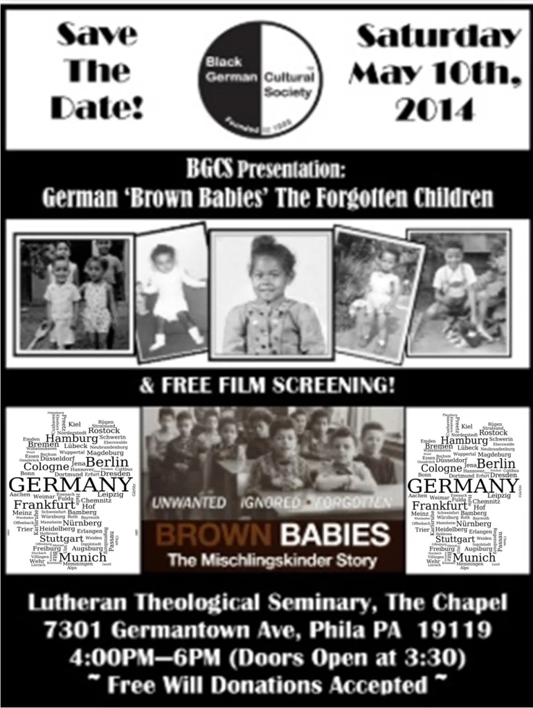 BGCS Presentation and Display: Germany’s ‘Brown Babies’: The Forgotten Children & Film Screening: Brown Babies: The Mischlingskinder Story. A wonderful event, ending with a standing ovation! Thanks to all for taking the time out of your busy schedules and for braving the thunderstorms to learn about the little-known History of post-WWII Afro-German Occupation Babies. Thanks to the Lutheran Theological Seminary for their support and for the use of their Chapel for the BGCS presentation. Last but never least, THANKS TO THE BGCS TEAM; THE BEST TEAM EVER.